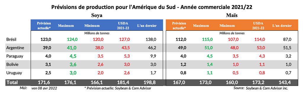 Dans son rapport sur les récoltes d'avril publié le jeudi 7 avril, Conab a réduit son estimation de la récolte de soya brésilien 2021/22 de 0,33 million de tonnes à 122,43 millions. Pour la récolte de maïs brésilien 2021/22, Conab a augmenté la production de maïs de 3,26 millions de tonnes à 115,6 millions.