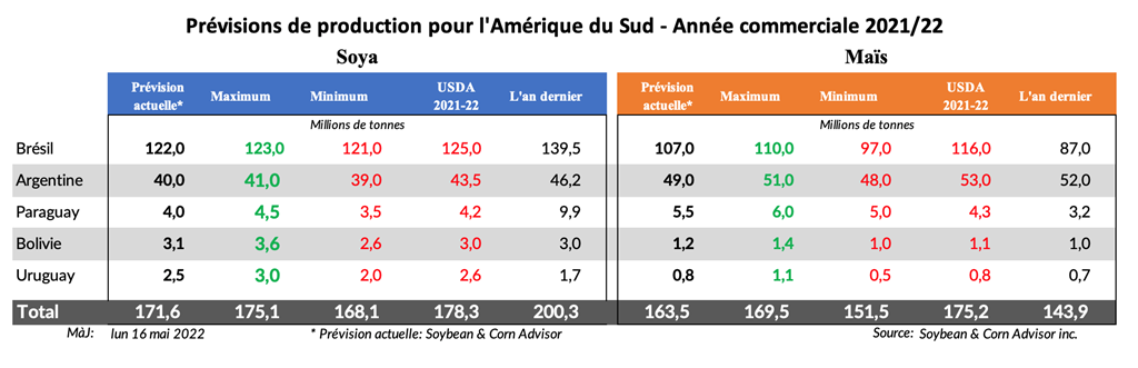 Dans le rapport corrigé, Conab a également ajusté le rendement du maïs safrinha. Le rapport original indiquait un rendement de maïs safrinha de 85,5 boisseaux/acre (en baisse de 2,2 boisseaux/acre par rapport à avril). Le rapport corrigé, indique plutôt un rendement de maïs safrinha de 85,6 boisseaux/acre (en baisse de 2,1 boisseaux/acre par rapport à avril).