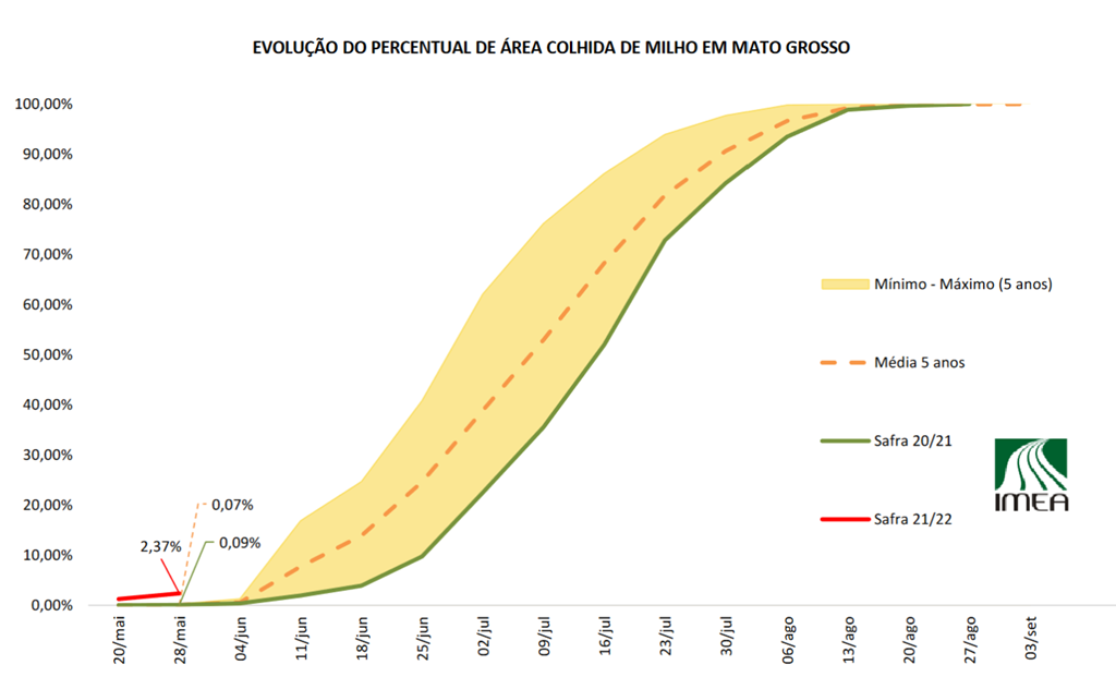 Mato Grosso - Selon l'Institut d'économie agricole du Mato Grosso, les agriculteurs de l'État avaient récolté 2,37 % de leur maïs safrinha à la fin de la semaine dernière, contre 0,09 % l'an dernier et 0,07 % pour la moyenne des 5 dernières années. Le rythme de la récolte du maïs dans le Mato Grosso s'accélérera à mesure que nous avancerons en juin. L'ouest et le sud du Mato Grosso ont été les zones les plus sèches de l'État et la sécheresse a eu un impact sur les rendements du maïs safrinha.