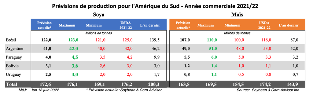 La récolte de maïs 2021/22 du Brésil est désormais en hausse de 32,3 % par rapport à 2020/21 ou 28,2 millions de tonnes. La consommation intérieure est estimée à 77,1 millions de tonnes et les exportations sont estimées à 37,0 millions de tonnes.