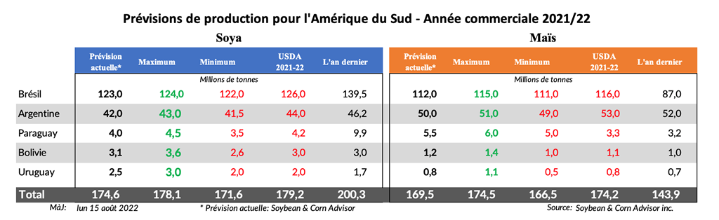 La superficie et la production de maïs du Brésil en 2022/23 devraient augmenter en raison du solide soutien des prix domestiques du maïs. Plusieurs facteurs devraient soutenir les prix intérieurs du maïs, notamment : le fait que le Brésil devrait commencer à exporter du maïs vers la Chine avant la fin de l'année, l’idée que le Brésil pourrait exporter du maïs vers l'Union européenne en raison des faibles rendements en Europe occidentale, l'expansion de l'industrie de l'élevage au Brésil qui exige plus de production de maïs, et plus de maïs qui rentre dans la production d’éthanol au Brésil. Tous ces facteurs sont positifs pour la production de maïs.