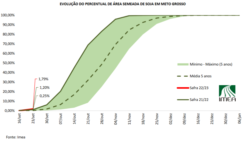 Mato Grosso - Jusqu'à présent, l'État a reçu des averses légères, mais des quantités plus importantes sont prévues pour cette semaine. Les agriculteurs du Mato Grosso ont été autorisés à commencer à semer leur soya le 16 septembre et l'Institut d'économie agricole du Mato Grosso (Imea) a indiqué que 1,8 % du soya avait été semé à la fin de la semaine dernière, contre 1,2 % l'an dernier et 0,2 % pour la moyenne des 5 dernières années. Ci-dessous, le graphique de la progression des semis de soya du Mato Grosso. Il provient d'Imea.