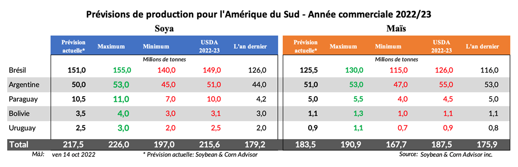 Les agriculteurs argentins commenceront à semer leur soya 2022/23 dans 1 à 2 semaines. Les semis de soya commencent généralement vers la mi-octobre, novembre étant le principal mois d’ensemencement. Si le temps reste sec pendant les prochaines semaines, l'ensemencement du soya pourrait commencer plus tard que la normale. Un démarrage tardif pour le soya ne signifie pas nécessairement une baisse des rendements, car le temps plus tard dans l'été est le principal facteur déterminant pour les rendements du soya.