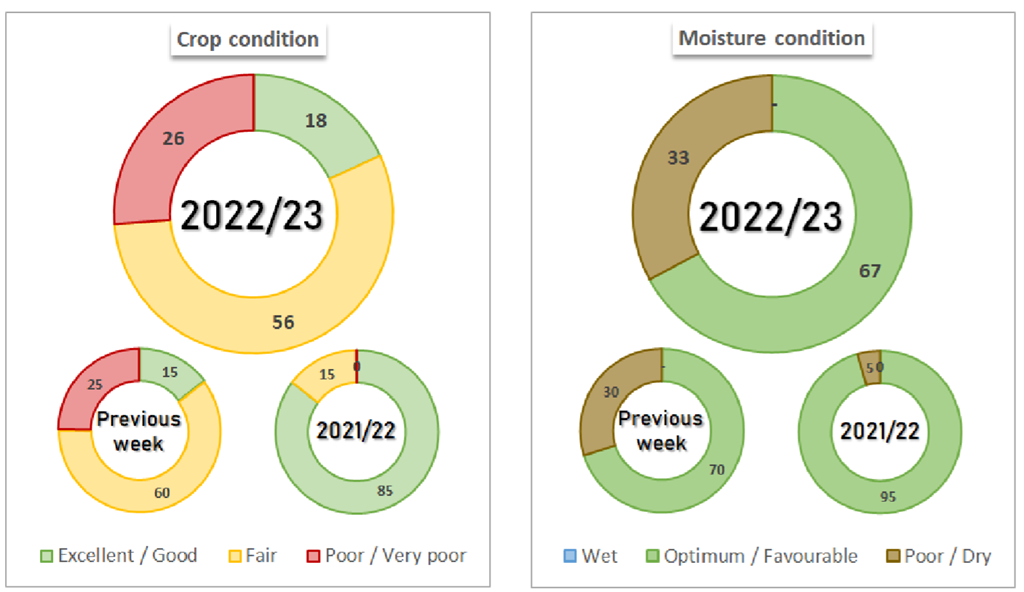 Les semis de maïs en Argentine continuent d'être retardés et les températures très chaudes de la semaine dernière ont frappé juste au moment où le maïs semé hâtivement a commencé à polliniser. L'état du maïs s'est légèrement amélioré la semaine dernière, mais la récolte n'est toujours jugée bonne/excellente qu'à 18 %. Les deux tiers du maïs doivent encore être semés et nous sommes déjà à la mi-décembre, donc le retard des semis exercera probablement une pression sur les rendements du maïs. De plus, il est possible que toutes les superficies de maïs prévues ne soient pas semées.