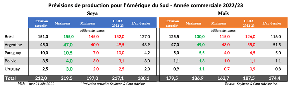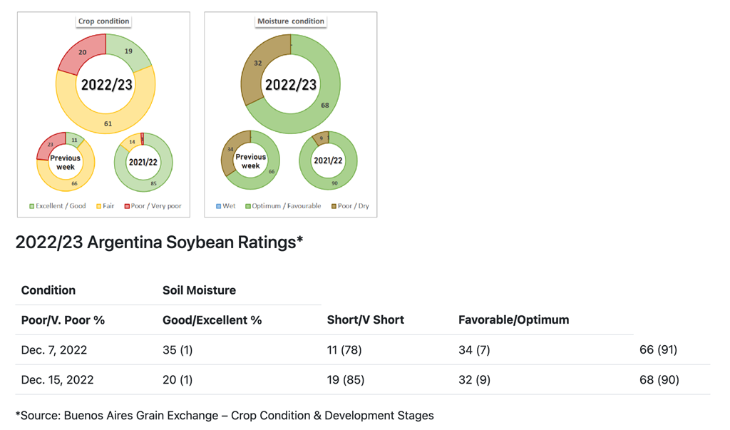 La production de soya argentine 2022/23 a été réduite de 2,0 millions de tonnes à 45,0 millions et elle pourrait encore baisser si le temps ne s'améliore pas. Si vous comparez cette année à l'année dernière, le soya est semé plus tard cette année par rapport à l'année dernière et le temps a été plus défavorable que l'an dernier. Les cultures de soya 2022/23 sont cotées à 19 % bonnes/excellentes contre 85 % l'an dernier. L'humidité du sol cette année est évaluée à 32 % déficiente/très déficiente contre 9 % l'an dernier. La récolte 2022/23 est en pire état que l'année dernière et la production de l'année dernière était de 44 millions de tonnes.
