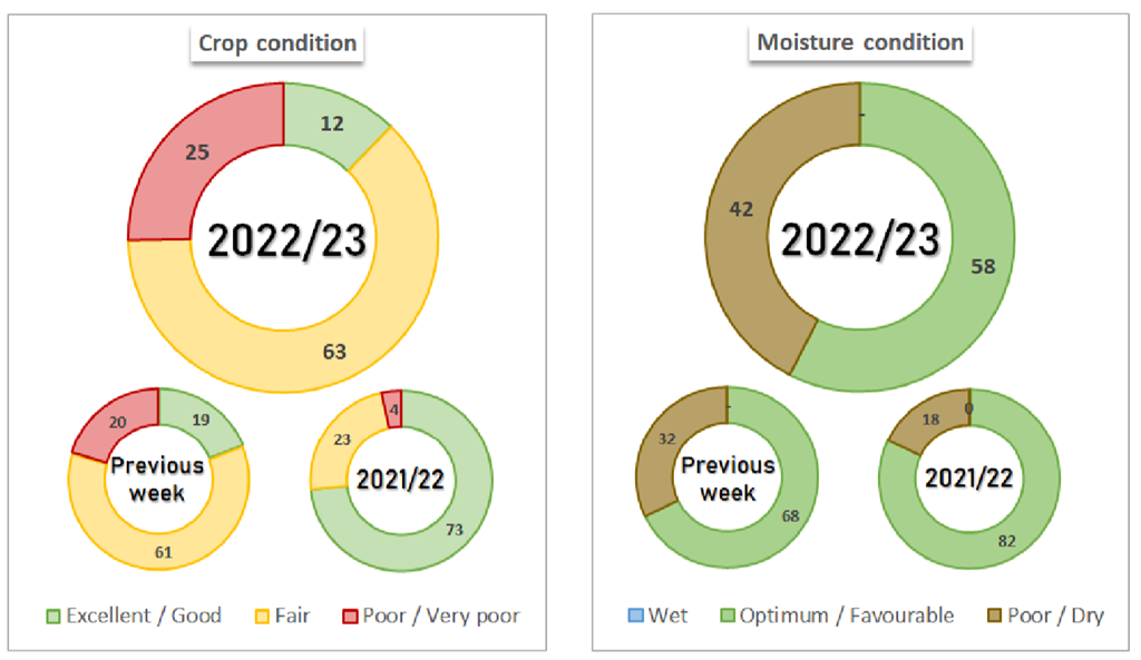 Les cultures de soya sont cotées à 25 % médiocres/très médiocres, 63 % passables et 12 % bons/excellents. Le pourcentage bon/excellent est en baisse de 7 points par rapport à la semaine précédente. L'humidité du sol pour le soya est évaluée à 42 % déficiente/très déficiente et à 58 % favorable/optimale. Le pourcentage favorable/optimal est en baisse de 10 points par rapport à la semaine précédente.