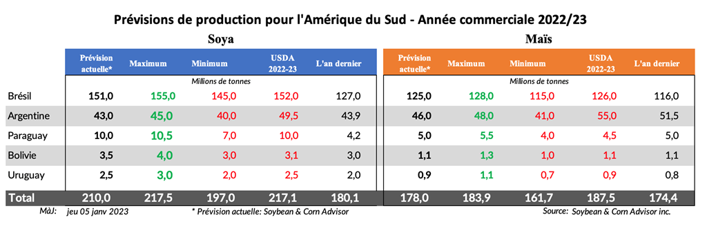 Les agriculteurs qui ont reçu de la pluie procéderont aux semis. Les agriculteurs qui n'ont pas reçu de précipitation attendront probablement plus d'humidité avant de semer, mais le temps presse pour les ensemencements de soya. Si aucune pluie supplémentaire n'est reçue vers le 15 janvier, la période des ensemencements de soya se terminera et les superficies de soya pourraient diminuer jusqu'à 500 000 hectares par rapport aux attentes initiales.