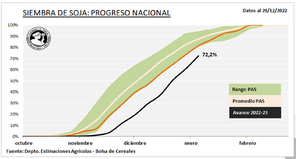 Vous trouverez ci-dessous un tableau de la bourse des grains de Buenos Aires qui montre les progrès des ensemencements de soya en Argentine (ligne noire) et comme vous pouvez le voir, les ensemencements de soya ont un peu rattrapé, mais ils sont encore très retardés.