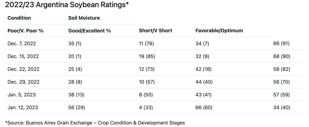 L'estimation du soya de l'Argentine a été abaissée en raison d'une combinaison de rendements inférieurs et de superficies réduites. La zone la plus durement touchée par les conditions chaudes et sèches semble être l'est de Cordoue, le centre et le centre-nord de Santa Fe et d’Entre Rios. Il s'agit de la zone étroitement surveillée par le Rosario Grain Exchange et l’organisme a estimé la semaine dernière que les rendements de soya dans cette région pourraient baisser jusqu'à 45 %.
