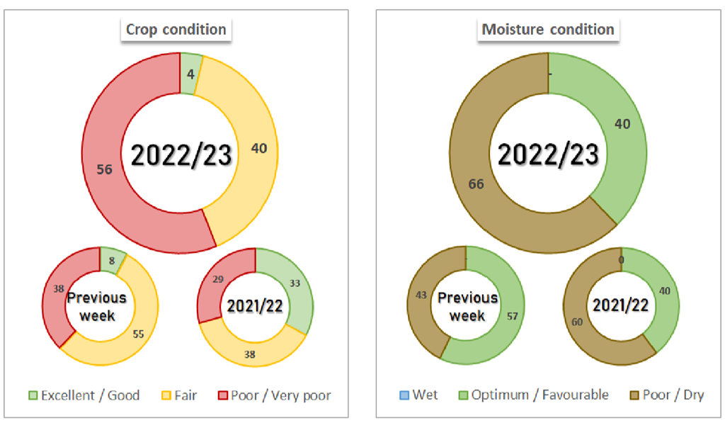 À la fin de la semaine dernière, le soya en Argentine était classé à 56 % médiocre/très médiocre, 40 % passable et à 4 % bon/excellent. Le pourcentage bon/excellent était en baisse de 4 points par rapport à la semaine précédente. L'humidité du sol pour le soya a été évaluée à 66 % déficiente/très déficiente et à 34 % favorable/optimale. Le pourcentage favorable/optimal est en baisse de 23 points par rapport à la semaine précédente.