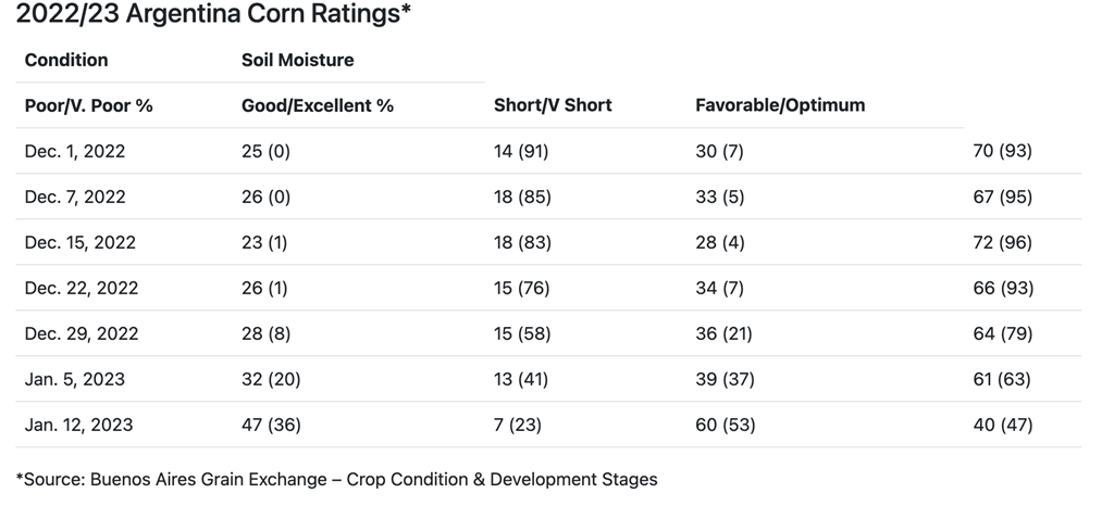 La bourse des grains de Rosario a abaissé son estimation du maïs à 45 millions de tonnes, contre 55 millions de tonnes précédemment estimées, tandis que la bourse des grains de Buenos Aires a laissé son estimation du maïs inchangée à 50,0 millions de tonnes, mais a averti que le pire des scénarios pourrait être aussi bas que 37,8. millions de tonnes. La société satellite, EarthDaily Analytics, estime la récolte de maïs argentin à 45,4 millions de tonnes.