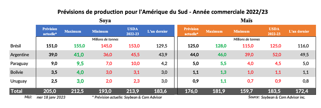 Le maïs en Argentine a été semé à 83 % à la fin de la semaine dernière, contre 86,4 % l'an dernier et 89,1 % pour la moyenne des 5 dernières années. Cela représente une avance de 13 % pour la semaine. La principale zone restant à semer est l'extrême nord de l'Argentine où le maïs est semé à 25-30 %. La période de ensemencements de maïs en Argentine se termine vers la fin janvier et il reste encore environ 1,2 million d'hectares à semer. La Bourse des grains de Buenos Aires a estimé jeudi dernier qu'environ 200 000 hectares de maïs ne seront pas semés, ce qui représenterait environ 3 % de la superficie de maïs prévue. Comme pour le soya, les agriculteurs peuvent essayer de semer leur maïs plus tard que ce qui est recommandé si le temps commence à s'améliorer d'ici la fin janvier.
