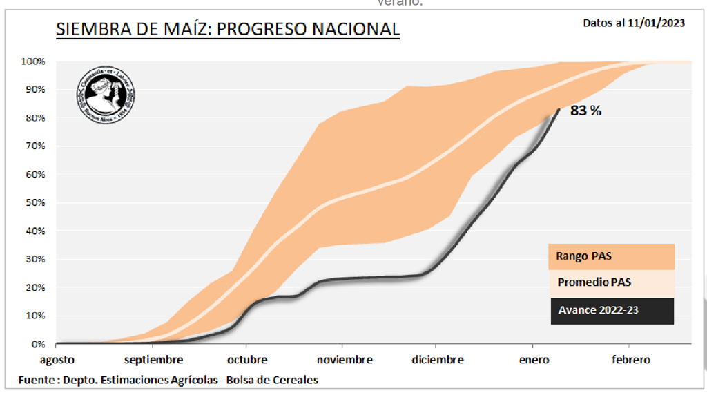 Ci-dessous, la progression des semis de maïs argentin (ligne noire) de la bourse des grains de Buenos Aires.