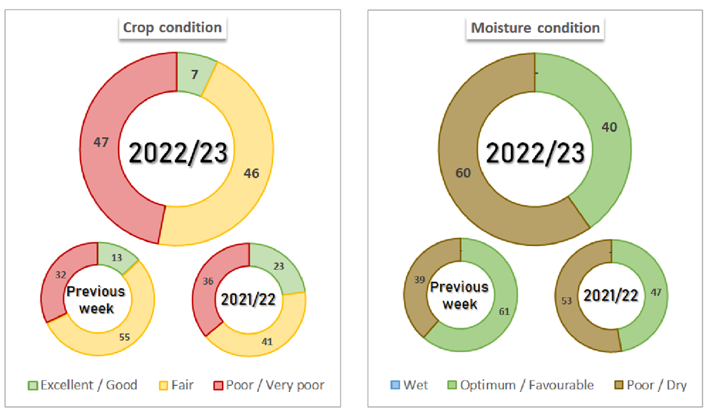 Le maïs en Argentine était coté à 47 % médiocre/très médiocre, 46 % passable et à 7 % bon à excellent à la fin de la semaine dernière. Le pourcentage bon/excellent était en baisse de 6 points par rapport à la semaine précédente. L'humidité du sol pour le maïs a été évaluée à 60 % déficiente/très déficiente et à 40 % favorable/optimale. Le pourcentage favorable/optimal est en baisse de 21 points par rapport à la semaine précédente.