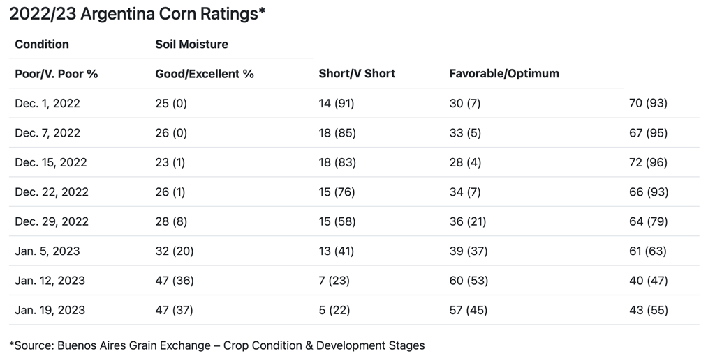 Vous trouverez ci-dessous l'évaluation de l'état du maïs en Argentine par la bourse des grains de Buenos Aires au 19 janvier 2023.
