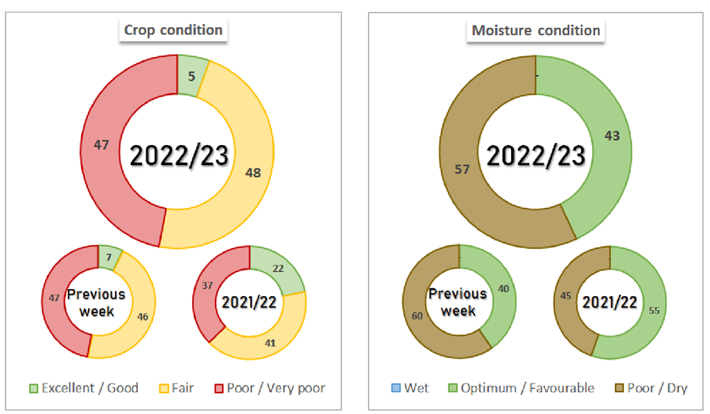 Le maïs est coté à 47 % médiocre/très médiocre, 48 % passable et à 5 % bon/excellent. Le pourcentage bon/excellent est en baisse de 2 % par rapport à la semaine précédente. L'humidité du sol pour le maïs est évaluée à 57 % déficiente/très déficiente et à 43 % favorable/optimale. Le pourcentage favorable/optimal est en hausse de 3 % par rapport à la semaine précédente.