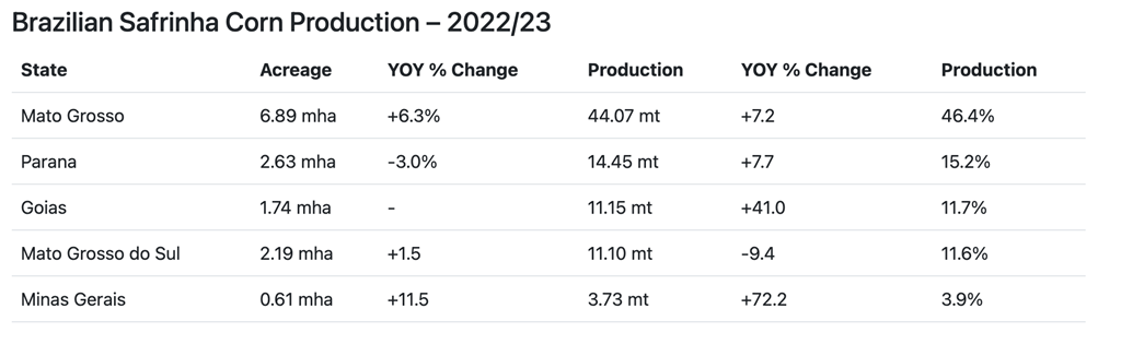 Dans le tableau ci-dessous figurent les cinq principaux États producteurs de maïs safrinha au Brésil d'après le rapport sur les récoltes de février de Conab. La superficie totale de maïs safrinha 2022/23 est estimée à 16,97 millions d'hectares (41,9 millions d'acres), soit une augmentation de 3,7 % par rapport à l'année dernière. La production totale de maïs safrinha 2022/23 est estimée à 94,96 millions de tonnes, soit une augmentation de 10,6 % par rapport aux 85,89 millions de tonnes produites l'année dernière. Comme vous pouvez le voir, le Mato Grosso devrait produire près de la moitié de tout le maïs safrinha au Brésil.