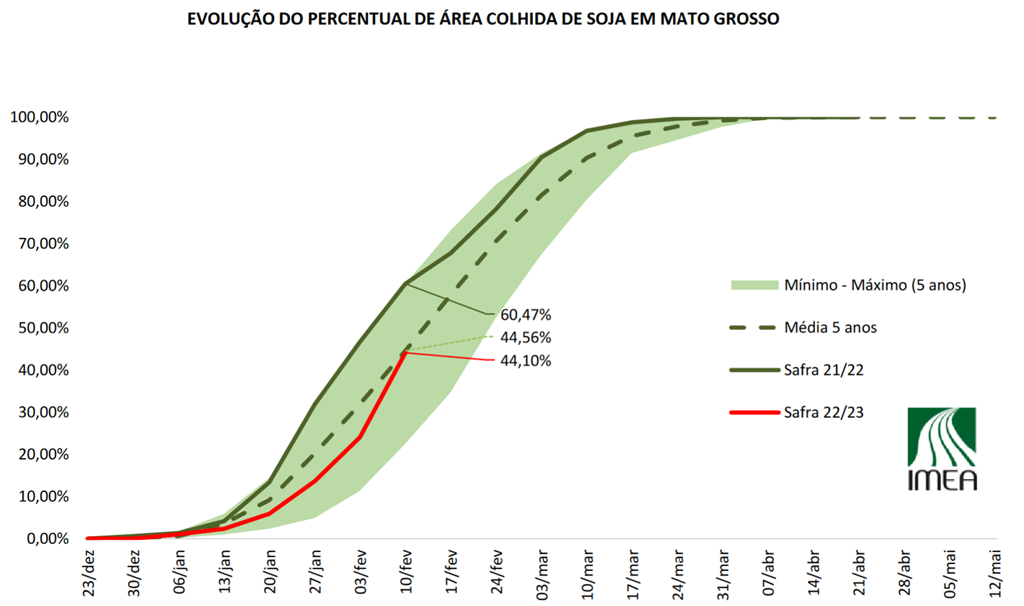 Le graphique ci-dessous de l'Institut d'économie agricole du Mato Grosso (Imea) montre l'avancement de la récolte de soya 2022/23 dans le Mato Grosso (ligne rouge). Comme vous pouvez le constater, les agriculteurs ont bien avancé la récolte la semaine dernière.