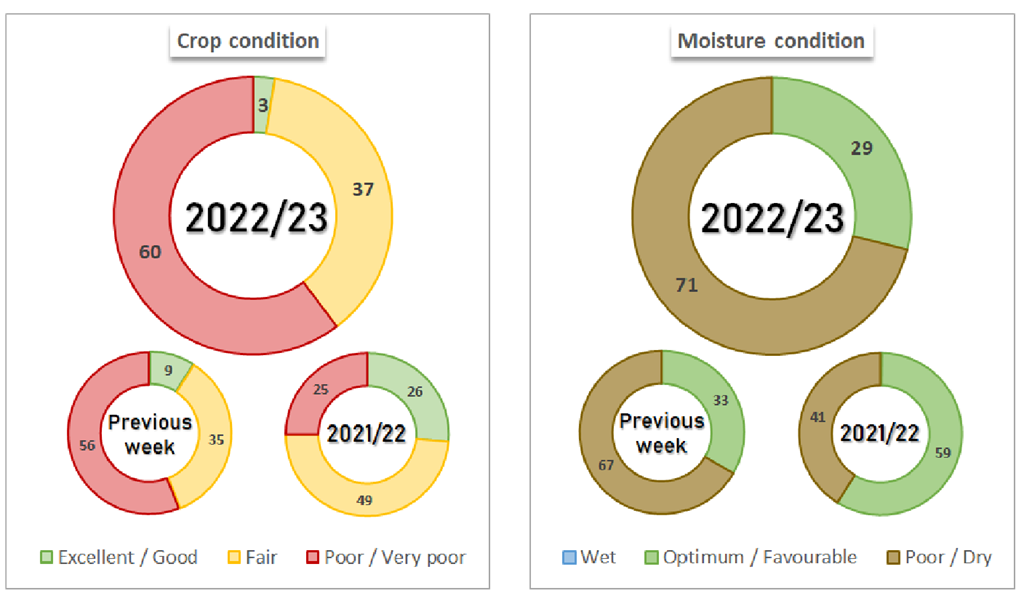Les cultures de soya 2022/23 en Argentine ont été cotées à 60 % médiocres/très médiocres, 37 % passables et 3 % bonnes/excellentes. Le pourcentage bon/excellent était en baisse de 6 % par rapport à la semaine précédente. L'humidité du sol pour le soya a été évaluée à 73 % déficiente/très déficiente et à 29 % favorable/optimale. Le pourcentage favorable/optimal était en baisse de 4 % par rapport à la semaine précédente.