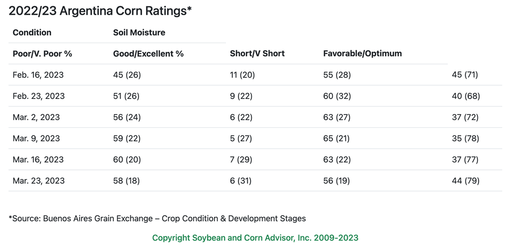 Vous trouverez ci-dessous l'évaluation de l'état du maïs en Argentine par la bourse des grains de Buenos Aires au 23 mars 2023.