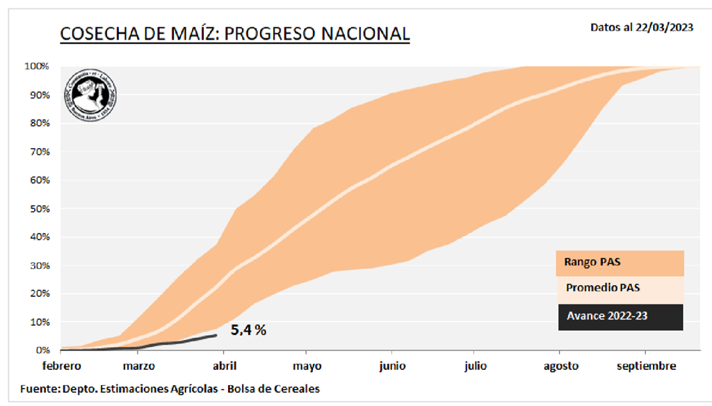Ci-dessous, la progression de la récolte de maïs de la bourse des grains de Buenos Aires (ligne noire).