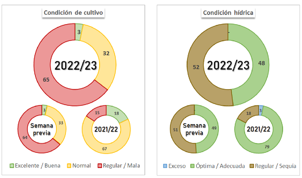 Les cultures de soya ont été évaluées à 65 % médiocre/très médiocre, 32 % passable et 3 % bonne/excellente. Le pourcentage bon/excellent est resté inchangé par rapport à la semaine précédente. L'humidité du sol pour le soya a été évaluée à 52 % déficiente/très déficiente et à 48 % favorable/optimale. Le pourcentage favorable/optimal est en baisse de 1 % par rapport à la semaine précédente.