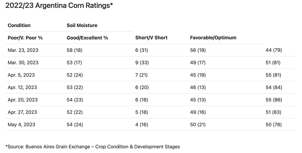 Vous trouverez ci-dessous l'évaluation de l'état du maïs en Argentine par la Bourse des grains de Buenos Aires pour le 4 mai 2023.