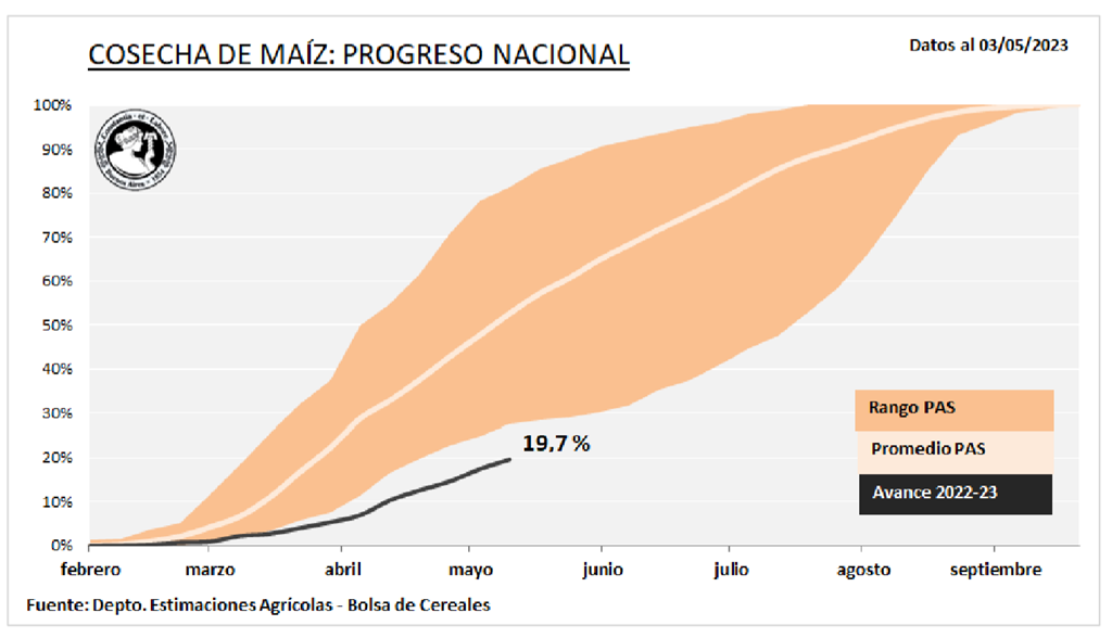 Ci-dessous, la progression de la récolte de maïs en Argentine (ligne noire) de la Bourse des grains de Buenos Aires.