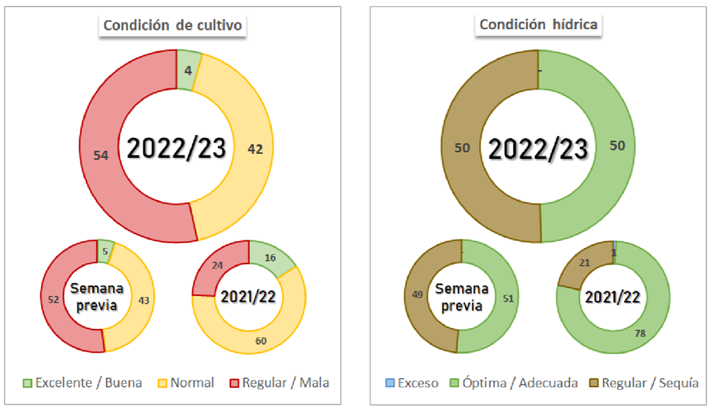 Le maïs en Argentine était coté, à la fin de la semaine dernière, à 54 % médiocre/très médiocre, 42 % passable et 4 % bon/excellent. Le pourcentage bon/excellent était en baisse de 1 % par rapport à la semaine précédente. L'humidité du sol pour le maïs a été évaluée à 50 % déficiente/très déficiente et à 50 % favorable/optimale. Le pourcentage favorable/optimal était en baisse de 1 % par rapport à la semaine précédente.