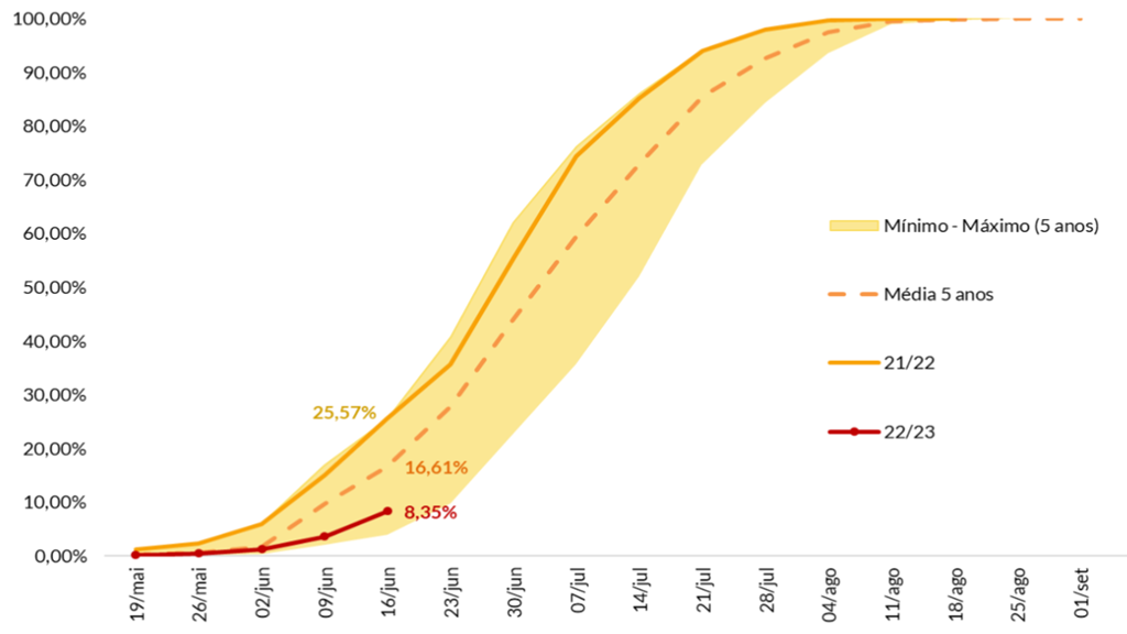 Ci-dessous, le rythme de récolte du maïs safrinha 2022/23 dans le Mato Grosso (ligne rouge) établi par l'Institut d'économie agricole du Mato Grosso.