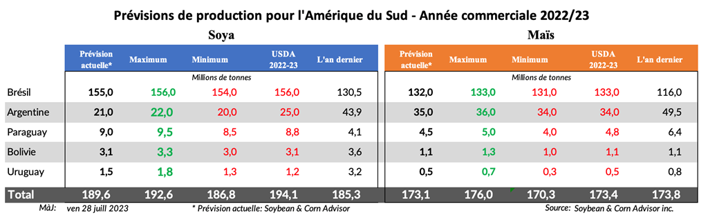À l'avenir, les bas prix actuels du soya et du maïs devraient rendre les agriculteurs brésiliens plus prudents concernant leurs récoltes 2023/24. La superficie de soya brésilien 2023/24 pourrait augmenter de 1 à 3 %, ce qui serait l'une des plus faibles augmentations des 17 dernières années. Les prix intérieurs du maïs sont encore plus décourageants que ceux du soya et la superficie de maïs brésilien 2023/24 pourrait n'augmenter que de 0 à 2 %.