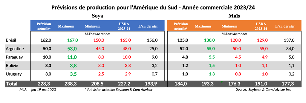 Les ensemencements de maïs en Argentine se déroule en deux étapes, la première se terminant vers la fin octobre et la deuxième commençant au début de décembre. Environ 40 % du maïs est semé au cours de la première phase, mais si la situation hydrique ne s'améliore pas rapidement, certains agriculteurs pourraient décider de réduire leur superficie de maïs hâtif, d'attendre une amélioration de l'humidité et de remplacer une partie de ces superficies de maïs par du soya. Il est un peu trop tôt pour le dire avec certitude, mais il est possible que les agriculteurs finissent par semer moins de maïs que prévu et plus de soya que prévu.