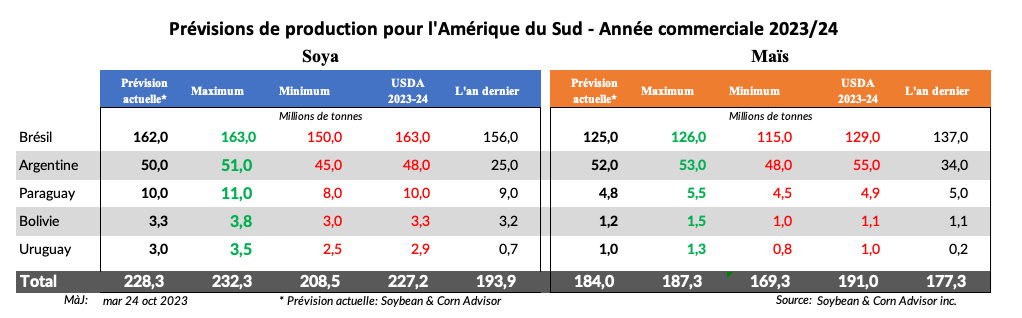 Si le régime pluviométrique dans le centre du Brésil ne s’améliore pas rapidement, je pourrais commencer à abaisser l’estimation de la production brésilienne de soya dès la semaine prochaine. Certains analystes au Brésil prévoient que la production brésilienne de soya 2023/24 sera inférieure à 160 millions de tonnes. Conab l‘estime actuellement à 162,0 millions de tonnes et l'USDA à 163,0 millions de tonnes.
