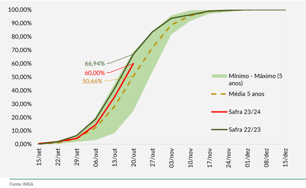 Un retard dans les semis du soya signifie un retard dans les ensemencements du maïs safrinha. Or, les agriculteurs étaient déjà préoccupés par la faiblesse du prix intérieur du maïs et le manque de marges. Vous trouverez ci-dessous les progrès des ensemencements de soya (ligne rouge), un tableau de l'Institut d'économie agricole du Mato Grosso (Imea).