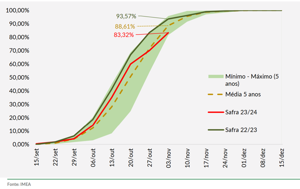 Vous trouverez ci-dessous les progrès des semis de soya 2023/24 dans le Mato Grosso (ligne rouge) de l'Institut d'économie agricole du Mato Grosso (Imea).
