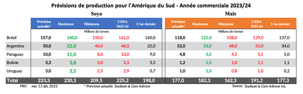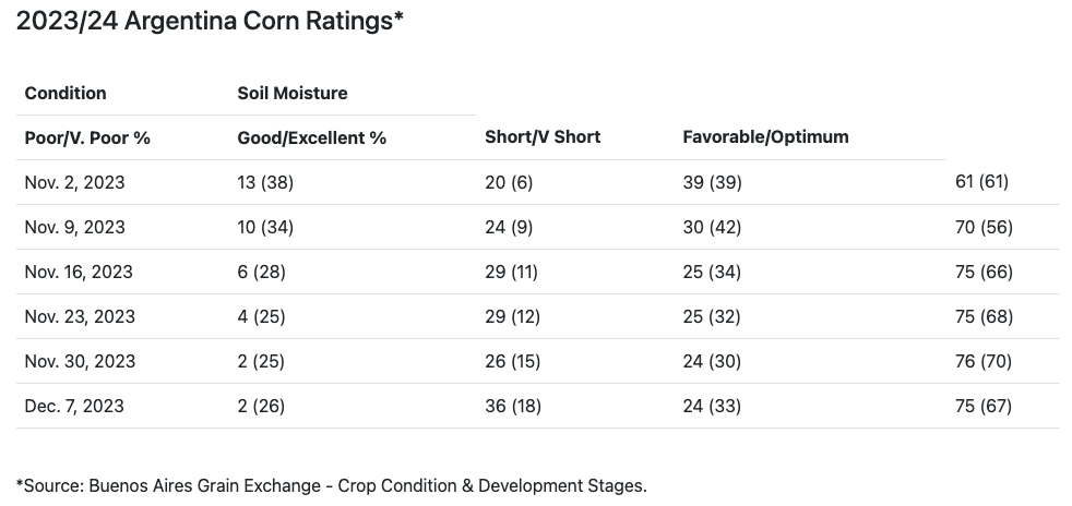 La Bourse des grains de Buenos Aires estime la récolte de maïs argentin 2023/24 à 55,0 millions de tonnes. Dans le rapport WASDE de décembre, l'USDA a laissé inchangée l'estimation du maïs argentin pour 2023/24 à 55,0 millions de tonnes.