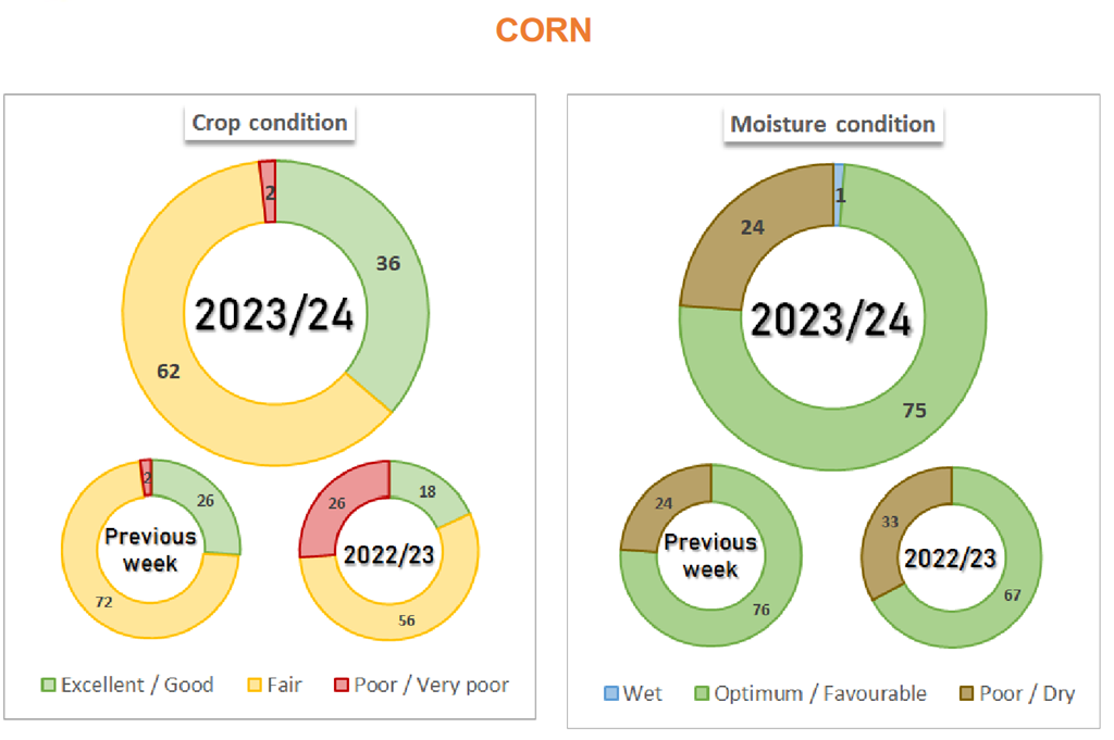 Le maïs est coté à 2 % comme mauvais/très mauvais, à 62 % comme moyen et à 36 % comme bon/excellent. Le pourcentage bon/excellent est en hausse de 10 % par rapport à la semaine précédente. L’humidité du sol pour le maïs est évaluée à 24 % déficiente/très déficiente et à 75 % favorable/optimale. Le pourcentage favorable/optimal est en baisse de 1 % par rapport à la semaine précédente.