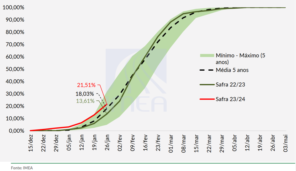 Mato Grosso - Les agriculteurs de l'État avaient récolté 21,5 % de leur soya à la fin de la semaine dernière, contre 13,6 % l'année dernière et 18 % pour la moyenne des 5 dernières années. Cela représente une avance de 8,6% sur la semaine. La récolte la plus avancée se situe dans l'ouest du Mato Grosso, où 34 % du soya a été récolté. Vous trouverez ci-dessous le rythme de récolte du soya dans le Mato Grosso (ligne rouge) de l'Institut d'économie agricole du Mato Grosso (Imea).