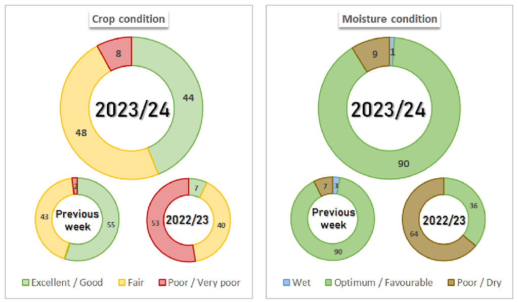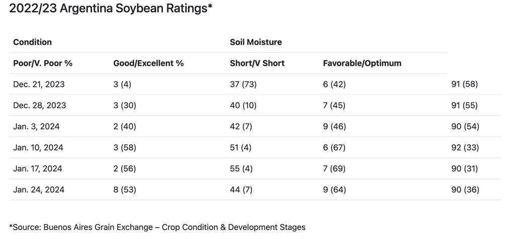 La Bourse des grains de Buenos Aires a augmenté la semaine dernière l'estimation du soya pour 2023/24 de 0,5 million de tonnes, à 52,5 millions. Ils ont augmenté la superficie en soya de 200 000 hectares pour atteindre 17,3 millions d’hectares (42,7 millions d'acres). Ils ont indiqué que des précipitations futures seront nécessaires, en particulier pendant la reproduction, pour maintenir l'estimation de production actuelle.
