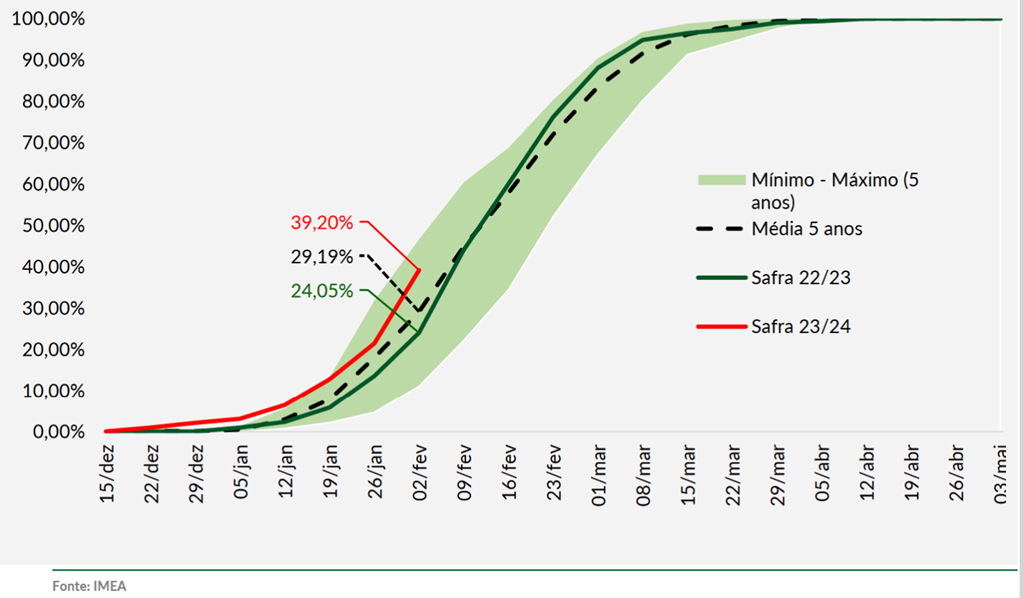 Dans la municipalité de Canarana, dans l'est du Mato Grosso, les rendements hâtifs du soya sont de l'ordre de 20 à 40 sacs par hectare (17,8 à 35,7 boisseaux/acre). Des pluies très localisées et des températures élevées ont eu un impact négatif sur le soya semé hâtivement. De plus, le temps sec a retardé l'achèvement des semis de soya jusqu'en décembre et début janvier. Le rendement du soya semé tardivement est incertain à ce stade. Le rendement du soya récolté hâtivement l'an dernier dans la municipalité était d'environ 60 sacs par hectare (53,6 boisseaux/acre). Vous trouverez ci-dessous le rythme de récolte du soya 2023/24 dans le Mato Grosso (ligne rouge) présenté par l'Imea.