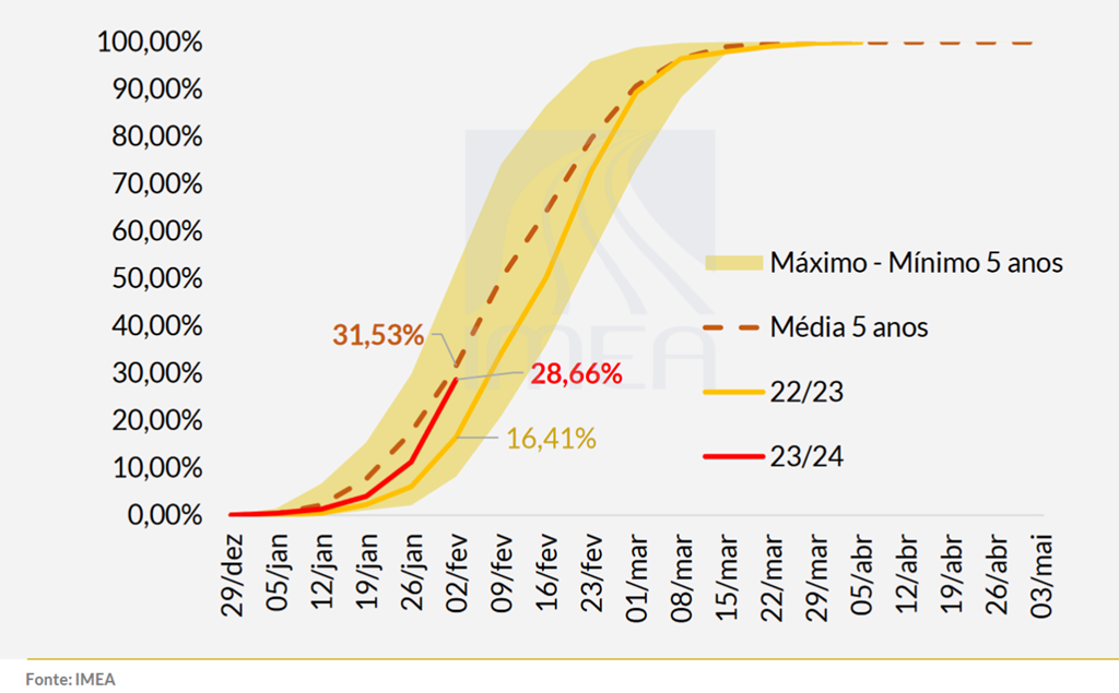 Dans la municipalité de Canarana, dans l'est du Mato Grosso, de nombreux agriculteurs vont réduire leurs superficies en safrinha, faute de rentabilité. Au lieu de cela, ils peuvent semer du sésame ou du sorgho en grains. Vous trouverez ci-dessous le rythme de semis de safrinha 2023/24 dans le Mato Grosso (ligne rouge) établi par l’Imea.
