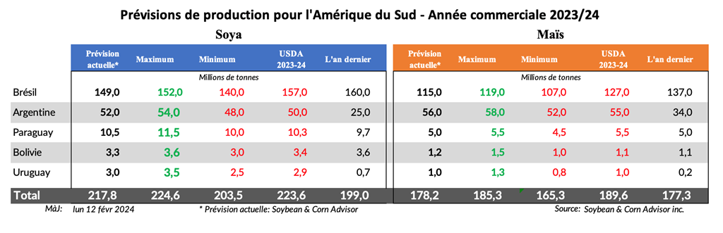 Pour la culture de soya brésilien, les estimations de superficie, de rendement et de production étaient toutes inférieures à celles de janvier. La superficie en soya pour 2023/24 a été réduite de 171 000 hectares par rapport à janvier, à 45,088 millions d’hectares (111,3 millions d'acres). Le rendement du soya au Brésil est désormais estimé à 3 314 kg/ha (49,3 boisseaux/acre), soit une baisse de 1,8 boisseaux/acre par rapport à janvier. La production brésilienne de soya en 2023/24, à 149,4 millions de tonnes, est en baisse de 5,2 millions de tonnes (3,4 %) par rapport aux 154,6 millions de tonnes de 2022/23.