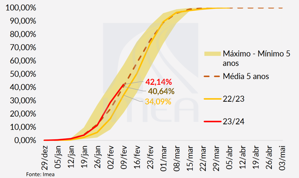 Maïs safrinha du Mato Grosso - Selon l'Imea, le maïs safrinha du Mato Grosso était semé à 42,1% à la fin de la semaine dernière, contre 34% l'année dernière et 40,6% pour la moyenne des 5 dernières années. Cela représente une avance de 13,4% sur la semaine. Les ensemencements les plus avancés se situent dans la région du centre-nord où le maïs safrinha est semé à 62 %. La région la plus lente se trouve dans le sud-est du Mato Grosso, où 24 % du maïs a été semé. Le prix moyen du maïs dans l'État la semaine dernière était de 39,40 réaux le sac (environ 3,62 $ le boisseau). Vous trouverez ci-dessous le rythme de semis du maïs safrinha 2023/24 dans le Mato Grosso (ligne rouge), un graphique d'Imea.