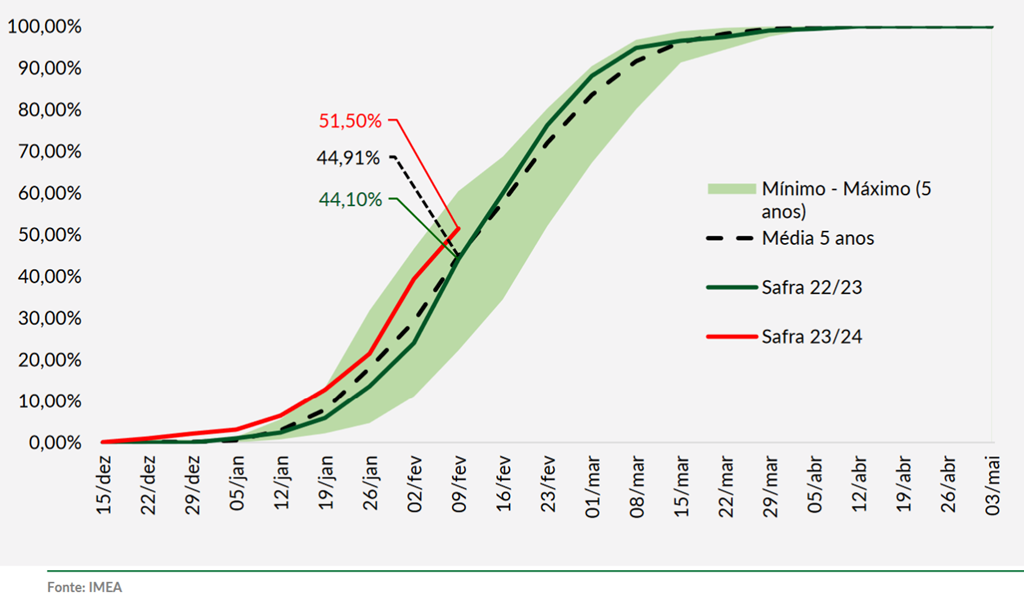 Les conditions sèches pourraient retarder les semis de maïs safrinha jusqu'à ce que des pluies supplémentaires améliorent l'humidité du sol. Septembre a été le seul mois de cette saison de croissance où les précipitations ont été supérieures à la normale. Entre octobre et janvier, les précipitations ont atteint environ 60 % de la normale. Vous trouverez ci-dessous l'avancement de la récolte de soya 2023/24 dans le Mato Grosso (ligne rouge), un graphique de l'Imea.