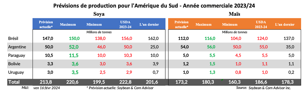 Dans son rapport de récolte de février, Conab a estimé la production de maïs du Brésil pour 2023/24 à 113,6 millions de tonnes, soit une baisse de 18,2 millions de tonnes (13,8 %) par rapport aux 131,8 millions produits en 2022/23. La récolte de maïs safrinha représente 77,4 % de la production totale de maïs du Brésil, la première récolte de maïs étant de 20,7 % et la troisième récolte de maïs de 1,7 %.