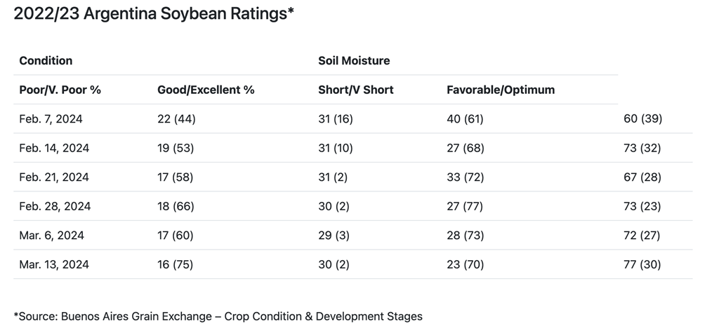 À la fin de la semaine dernière, le soya en Argentine était évalué à 16 % comme étant mauvais/très mauvais, à 54 % comme moyen et à 30 % comme bon/excellent. Le pourcentage de récoltes jugées bon/excellent a augmenté de 1 % par rapport à la semaine précédente. L'humidité du sol pour le soya a été évaluée à 23 % comme étant déficiente/très déficiente et à 77 % comme favorable/optimale. Le pourcentage d’humidité du sol jugé favorable/optimal a augmenté de 5 % par rapport à la semaine précédente. Vous trouverez ci-dessous la cote du soya argentin du 14 mars, établie par la Bourse des grains de Buenos Aires.