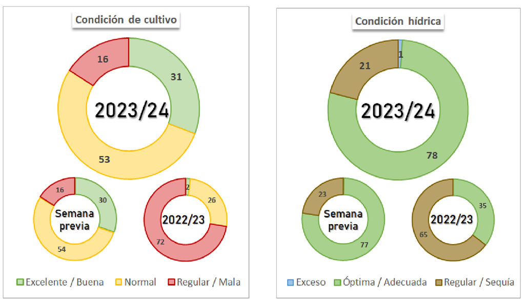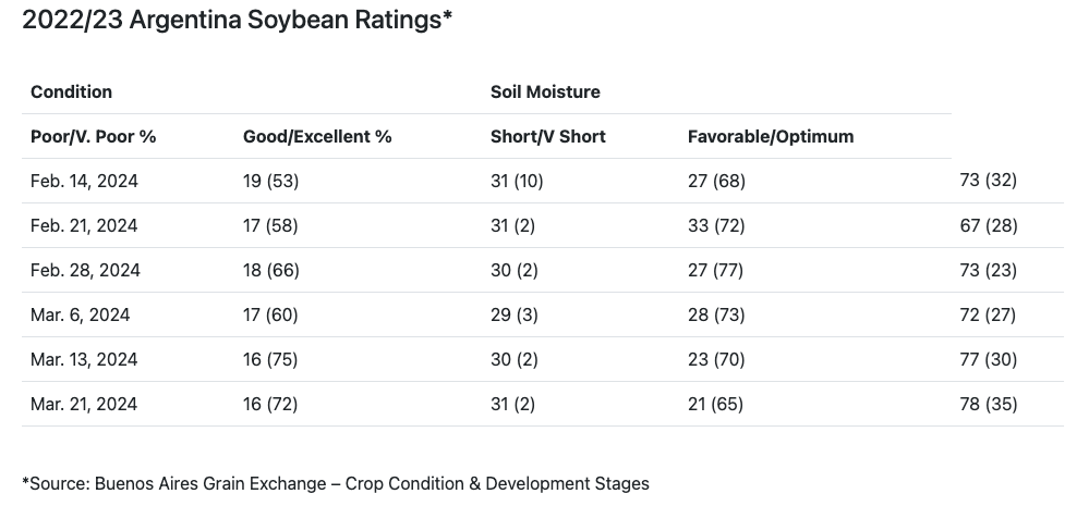 À la fin de la semaine dernière, le soya en Argentine était évalué à 16 % comme étant mauvais/très mauvais, à 53 % comme moyen et à 31 % comme bon/excellent. Le pourcentage bon/excellent est en hausse de 1% par rapport à la semaine précédente. L'humidité du sol pour le soya a été évaluée à 11 % comme étant déficiente/très déficiente, à 78 % comme favorable/optimale et à 1 % comme étant saturée. Le pourcentage favorable/optimal est en hausse de 1 % par rapport à la semaine précédente. Vous trouverez ci-dessous la cote du soya argentin du 21 mars 2024, établie par la Bourse des grains de Buenos Aires.