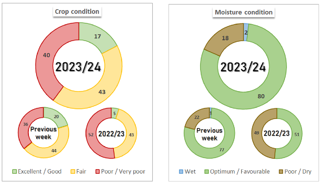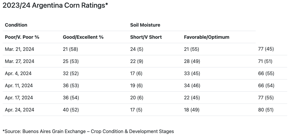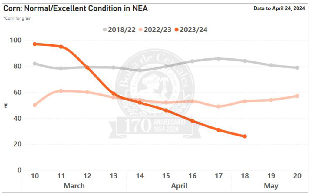 À la fin de la semaine dernière, le maïs était évalué à 40 % comme mauvais/très mauvais, à 43 % comme moyen et à 17 % comme bon/excellent. Le pourcentage bon/excellent est en baisse de 3% par rapport à la semaine précédente. L’humidité du sol pour le maïs a été évaluée à 18 % déficiente/très déficiente, à 80 % favorable/optimale et à 2 % saturée. Le pourcentage favorable/optimal était en hausse de 8 % par rapport à la semaine précédente. Vous trouverez ci-dessous la cote du maïs argentin du 24 avril 2024, établie par la Bourse des grains de Buenos Aires.