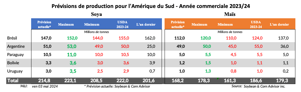 Les conditions chaudes et sèches ont un impact sur le maïs safrinha dans le centre-sud du Brésil. Le maïs pollinise et remplit les grains et il est déjà sec depuis au moins deux semaines avec un temps plus sec prévu. Ces conditions défavorables devraient entraîner une réduction des rendements du maïs safrinha. Le maïs safrinha représente plus de 75 % de la production totale de maïs du Brésil.