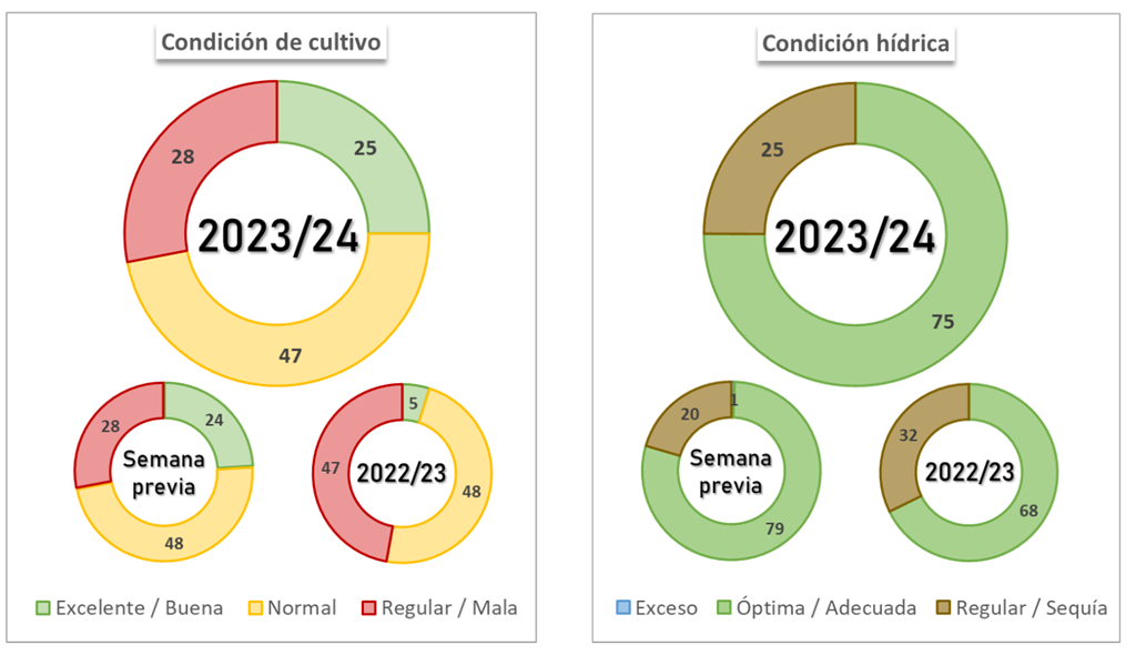 Le soya en Argentine a été classé 30 % comme médiocre/très médiocre, 48 % comme moyen et 22 % comme bon/excellent à la fin de la semaine dernière. Le pourcentage bon/excellent est en baisse de 3 % par rapport à la semaine précédente. L'humidité du sol pour le soya a été classée 28 % comme déficiente/très déficiente et 72 % comme favorable/optimale. Le pourcentage favorable/optimal est en baisse de 3 % par rapport à la semaine précédente. Vous trouverez ci-dessous la cote du soya argentin pour le 29 mai 2024 de la Bourse des grains de Buenos Aires.